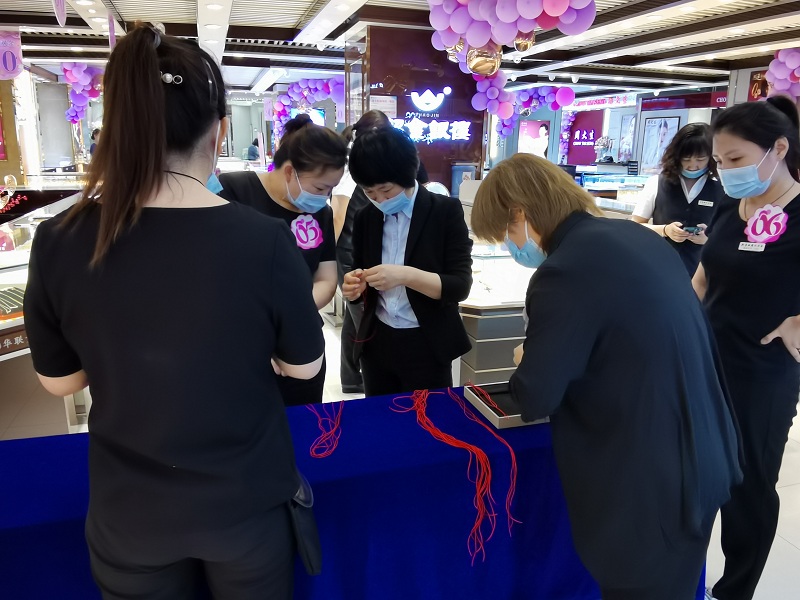 紅繩花樣編制項目不僅是單純的技能比武,編制好的紅繩還可以美化專(zhuān)柜的購物環(huán)境。紅繩花樣編制項目考驗員工掌握編制花樣的創(chuàng )意及速度,是極富有創(chuàng )新性和觀(guān)賞性的技能項目,可提升顧客的購物體驗。心靈手巧的員工將一根根普通簡(jiǎn)單的紅繩編制出各種實(shí)用且美觀(guān)大方的花樣,比賽結束后選手分別介紹所打花樣的創(chuàng )意與思路,每一個(gè)花樣的編制都傳達著(zhù)選手的美好心意。最終來(lái)自新華聯(lián)“中國結”專(zhuān)柜的高建紅以“得分220分,20個(gè)”的成績(jì)獲得擂主。