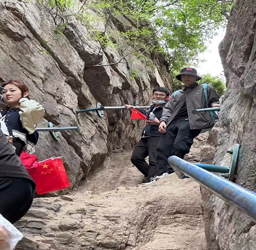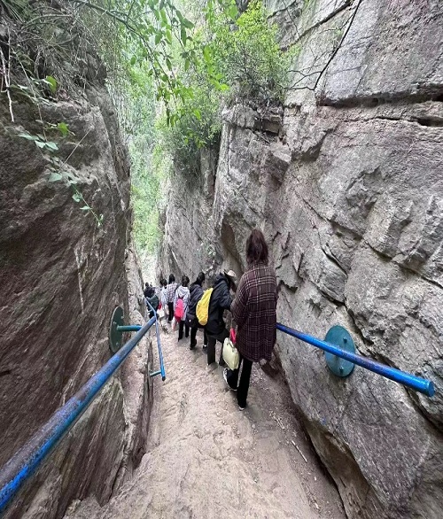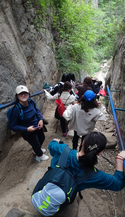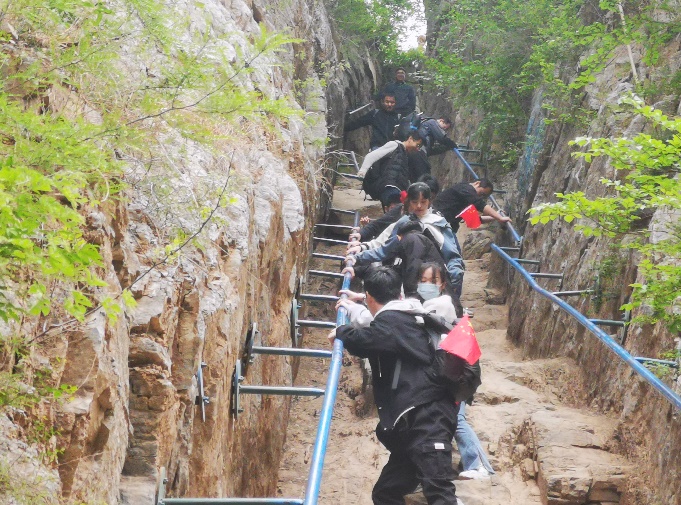 青年志愿者們果然不負眾望,在艱難險阻面前,充分展現出華聯(lián)人團結協(xié)作、互幫互助的精神。來(lái)自百貨事業(yè)部的韓齊齊,在徒步過(guò)程中,一直最活潑。別看她身材嬌小,在陡峭險情面前,卻絲毫“不怯場(chǎng)”,很快便大膽的穿過(guò)一線(xiàn)天,并熱心的在下面幫助接應著(zhù)陸續下山的小伙伴。任曉莉在徒步前,表示面對稍微有點(diǎn)高的臺階,就腿部發(fā)抖,此時(shí),面對更為陡峭的“一線(xiàn)天”,加上一直守護在她旁邊的李瑤瑤等小伙伴們的鼓勵和幫助,克服了心理障礙,勇敢順利通過(guò),當她從下往上看時(shí),不免感嘆,不敢相信自己原來(lái)這么“偉大”。